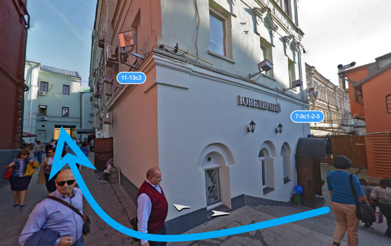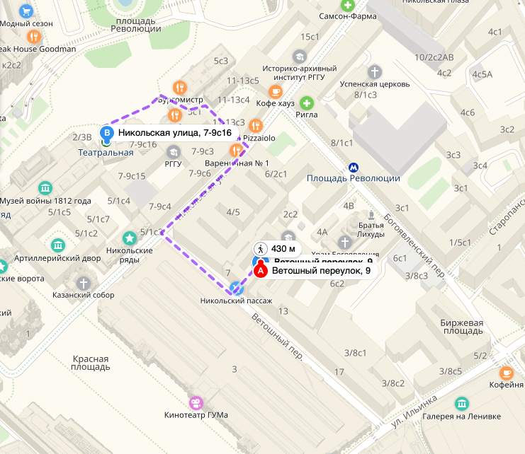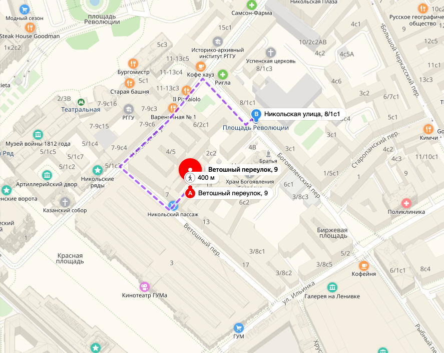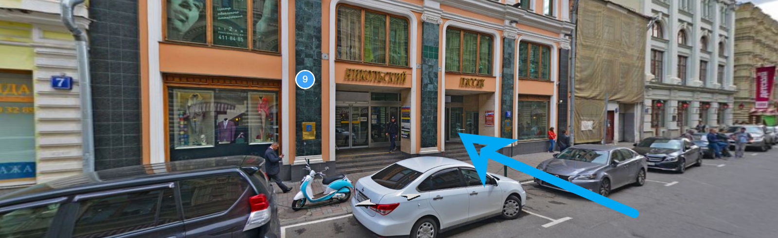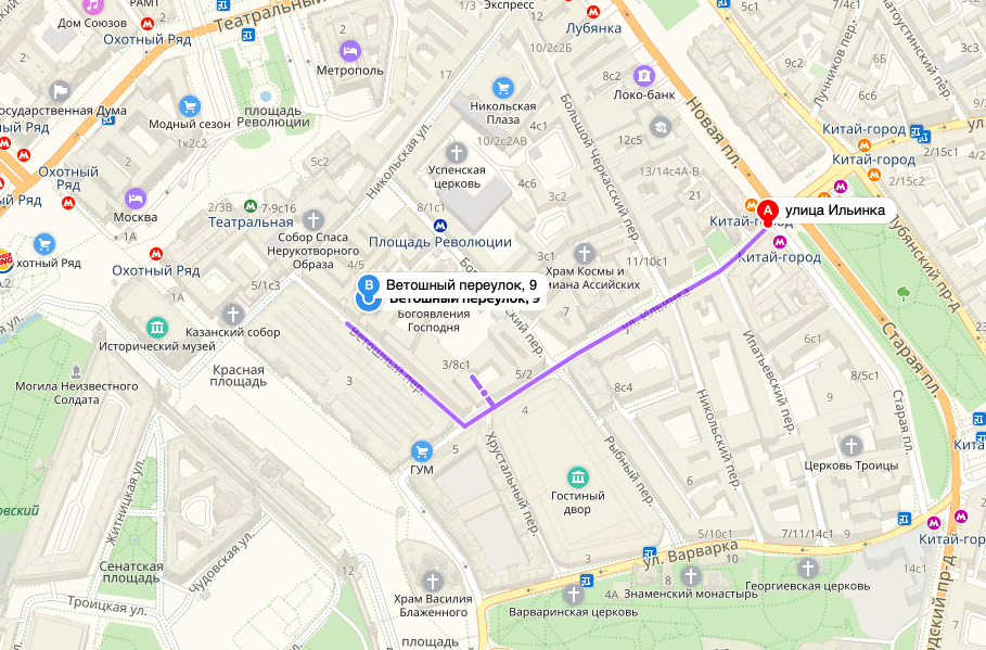 Двигаемся по улице Новая Площадь в сторону набережной, поворачиваем на ул.Ильинка, едем прямо до Детского ГУМа. Ветошный переулок находится между зданиями ГУМа и Детского ГУМа. Можно воспользоваться крытым паркингом или уличной парковкой на Ветошном переулке. Справа, на Ветошном переулке, находится Никольский Пассаж.